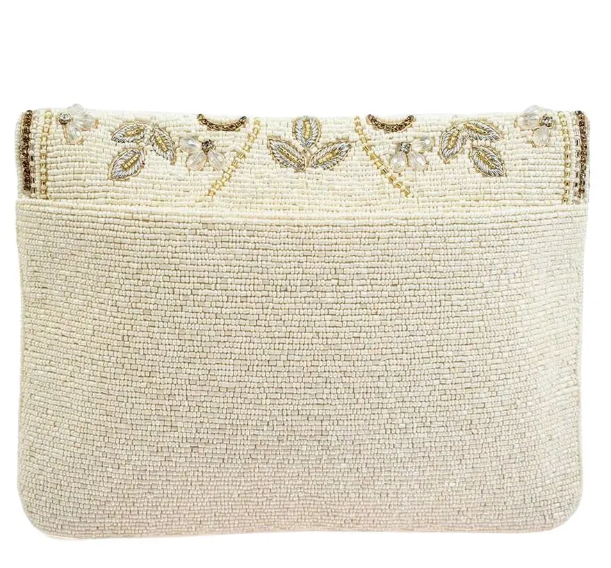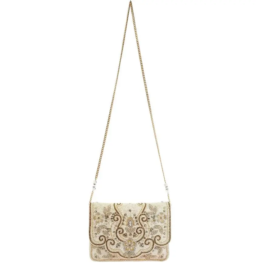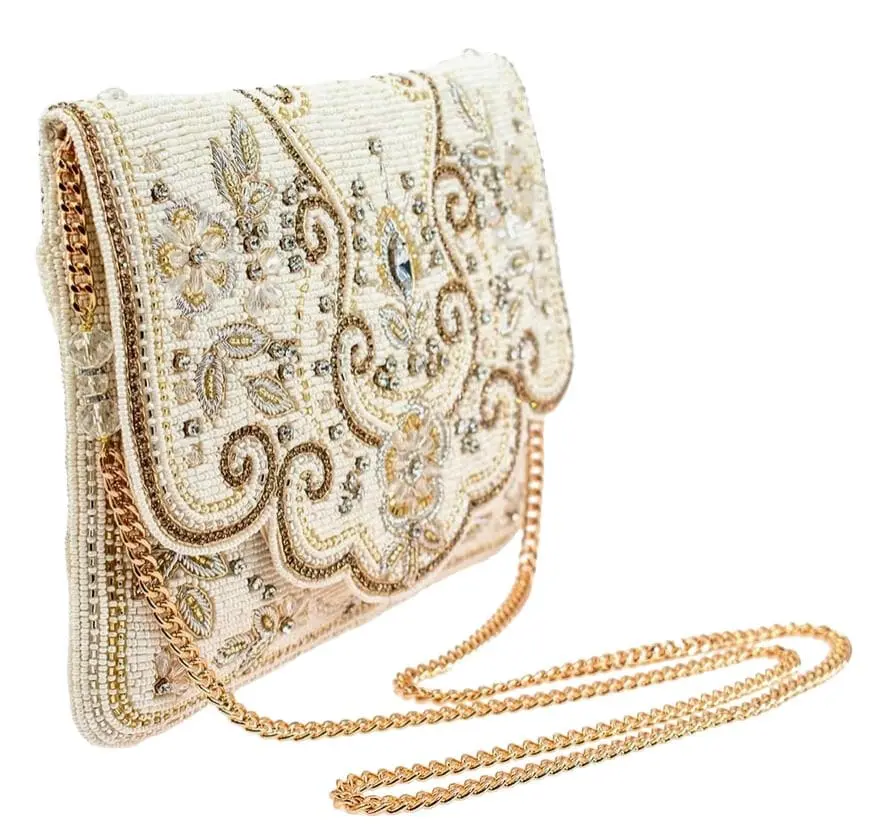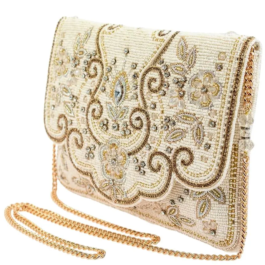 Flowing beaded florals enhanced with golden rhinestone chain make this handmade beaded crossbody handbag a dazzling display of beauty.