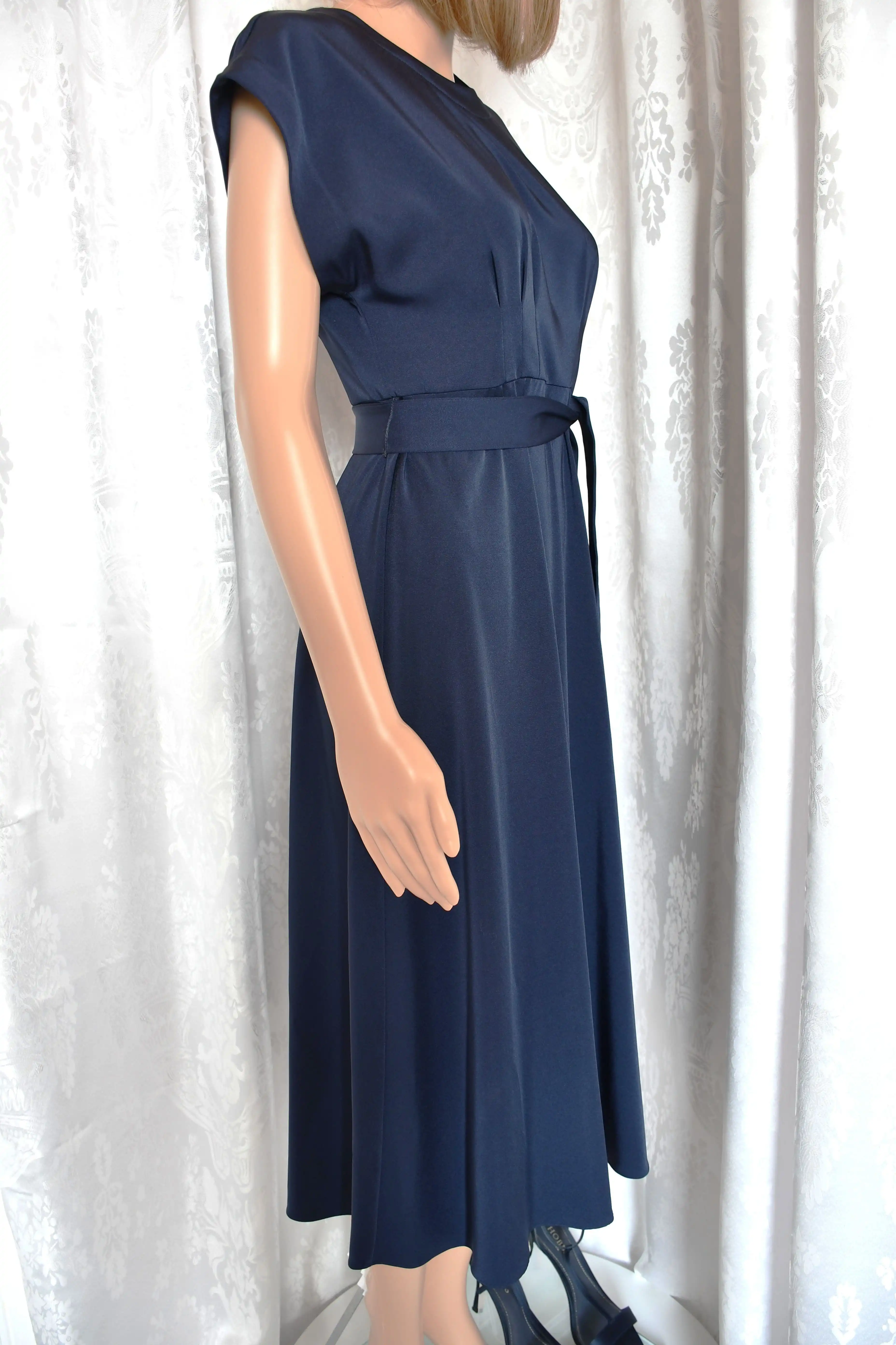 Dark Navy Midnight Dress in Petite Size 8 by Hobbs London. Designed in an endlessly flattering fit-and-flare shape, the Radclyffe dress is perfect for all manner of occasions. This item is pre-owned and only worn once for a wedding and in perfect condition. Original price £199, now selling for £55.