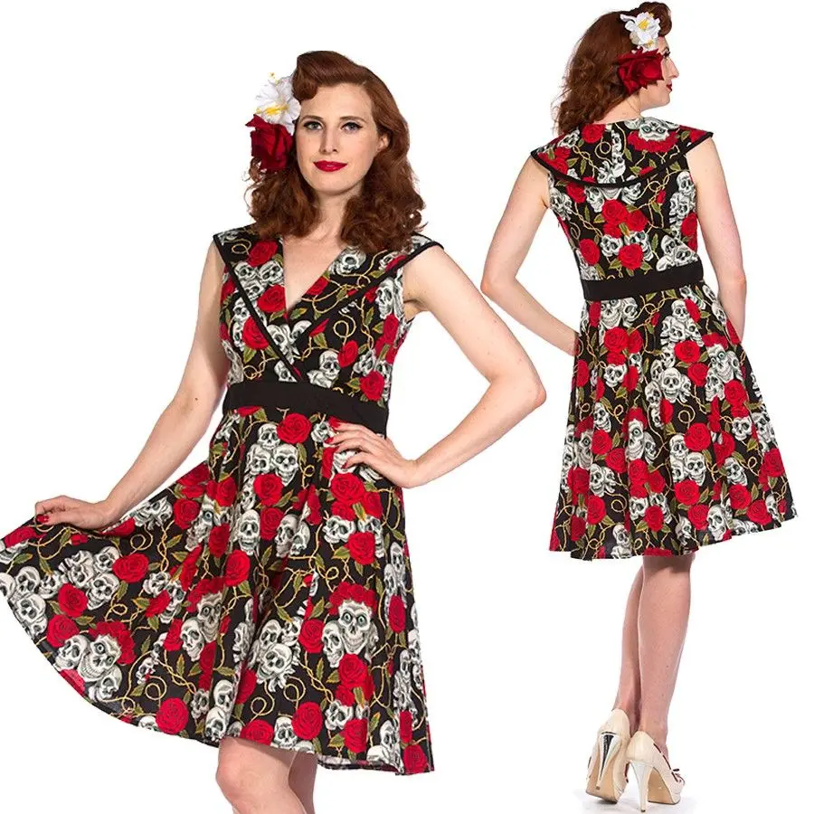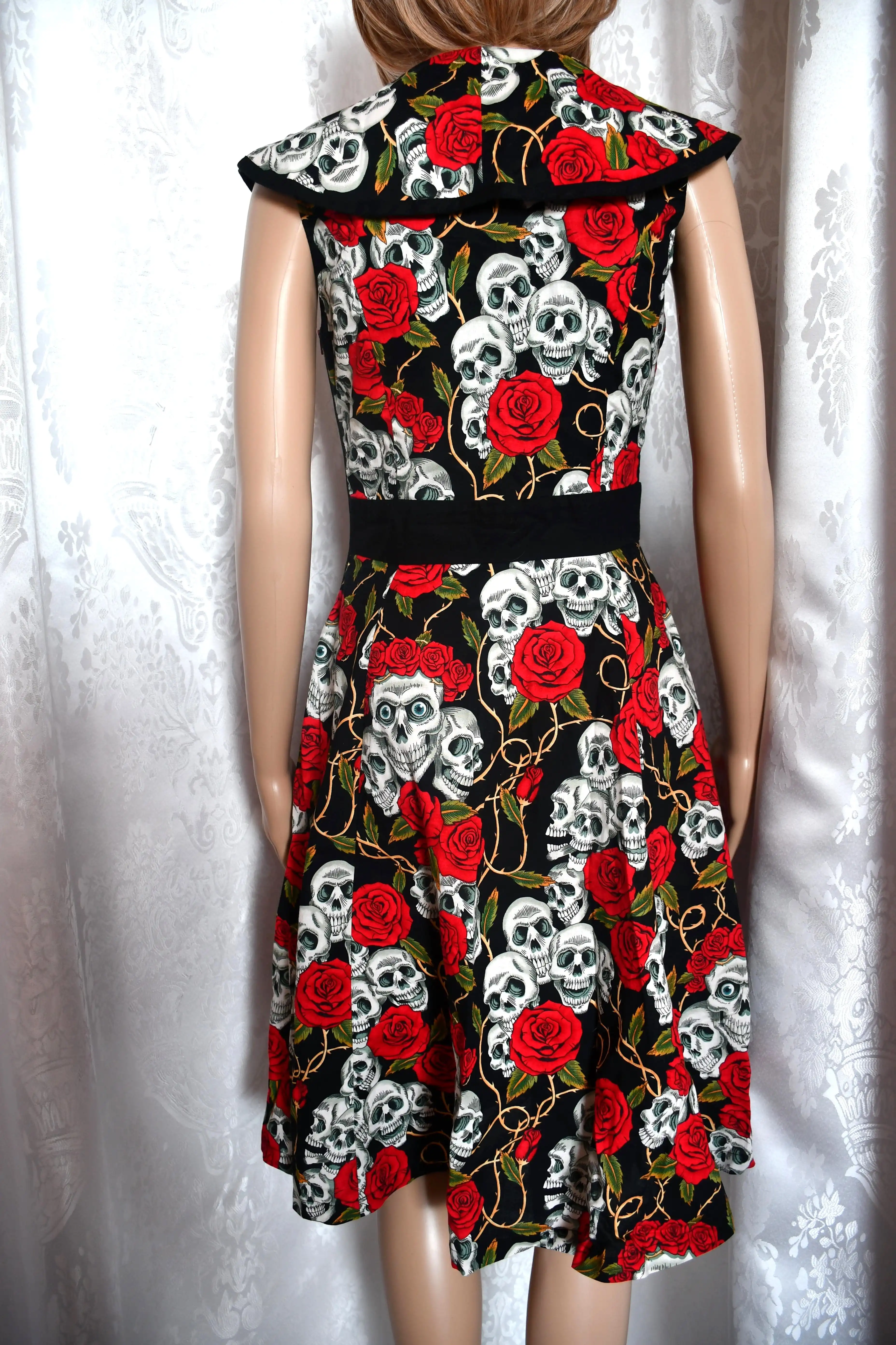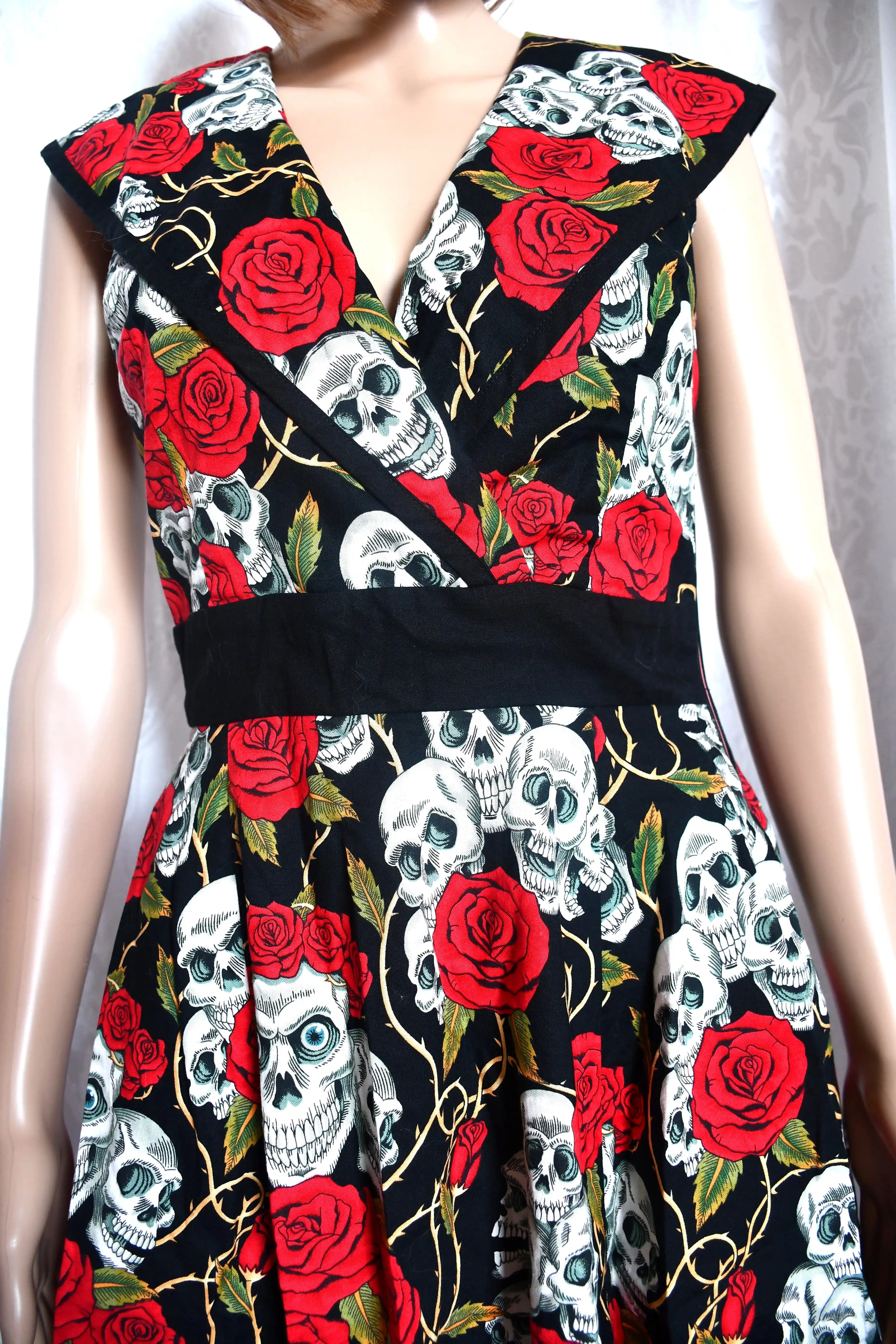 Multicoloured Midi Skull and Rose Dress. Vintage inspired 1950s retro dress for those who love rockability, individuality and alternative fashion styles.