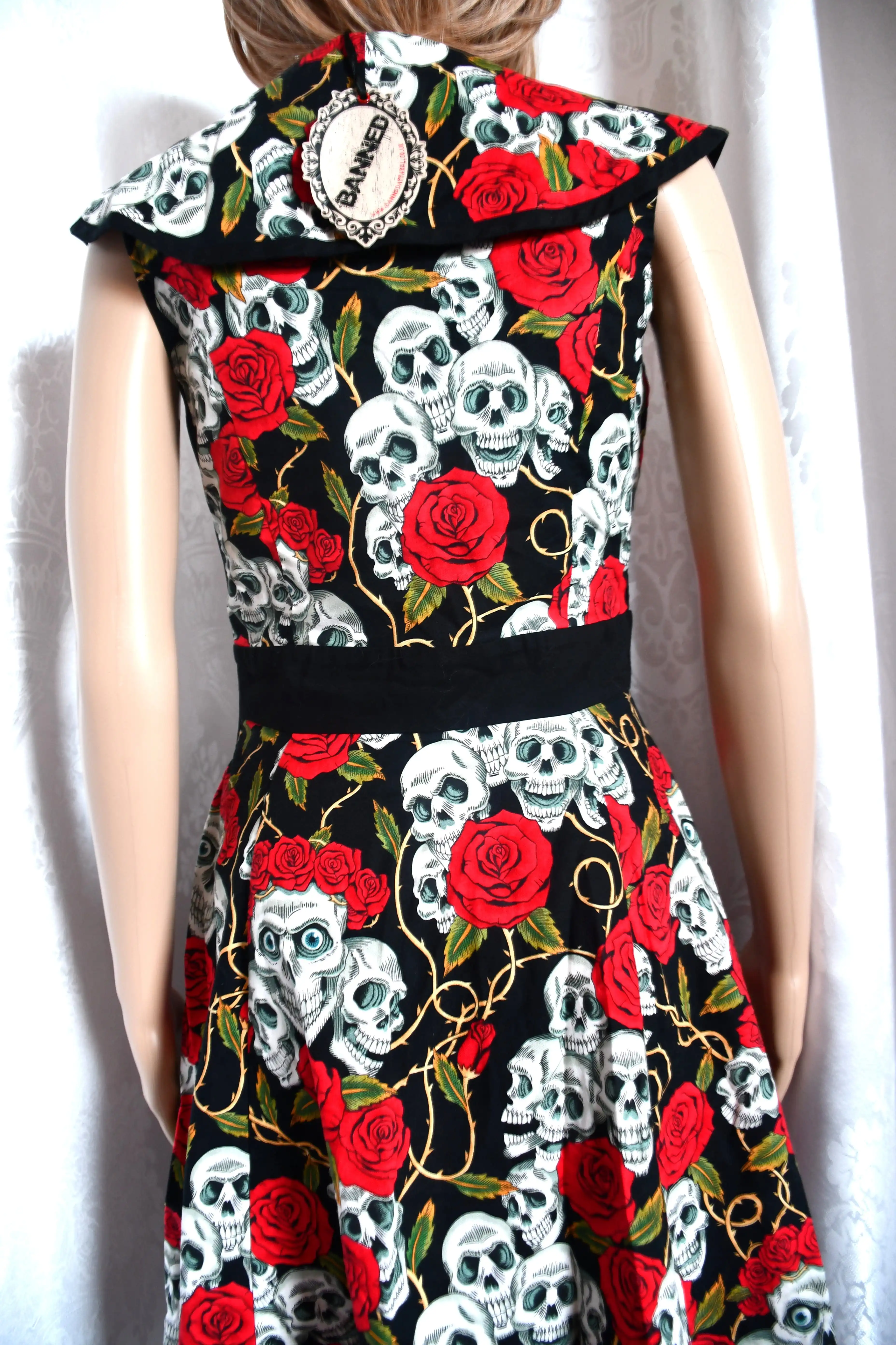 Multicoloured Midi Skull and Rose Dress Size XS by Banned. Vintage inspired 1950s retro dress with skull and rose design. For those who love rockability, individuality and alternative fashion styles.