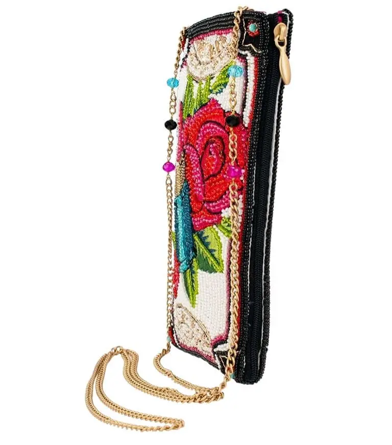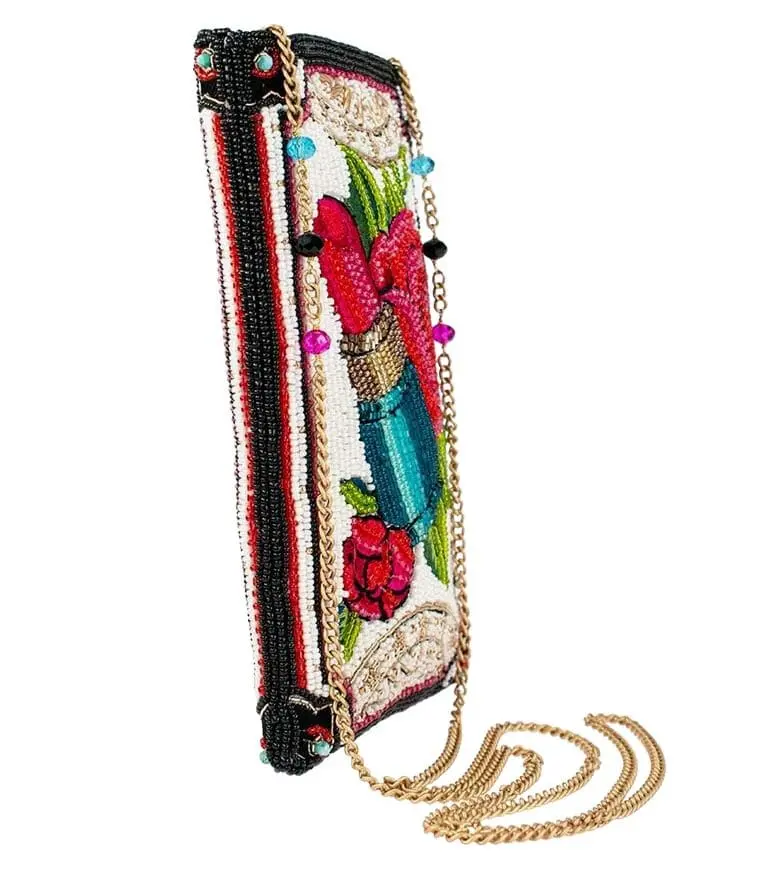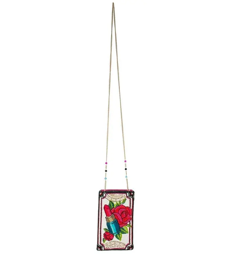 Beaded Crossbody phone bag Hello Gorgeous by Mary Frances. Showcasing a beautiful hand-beaded and embroidered design of roses and lipstick, making a stylish statement.