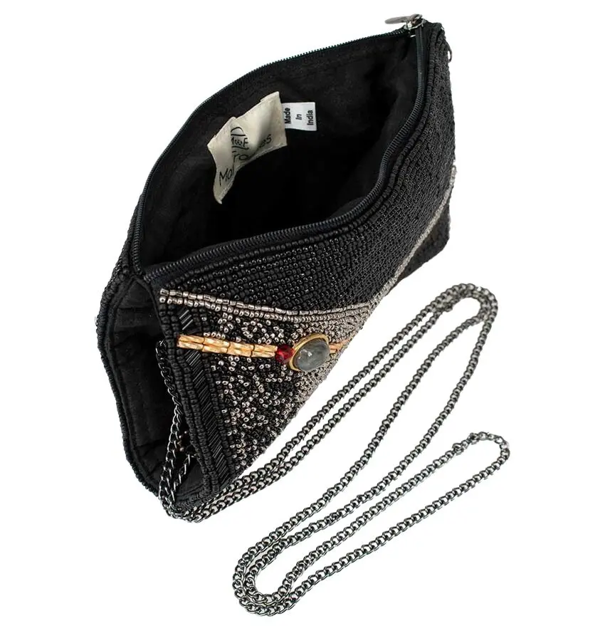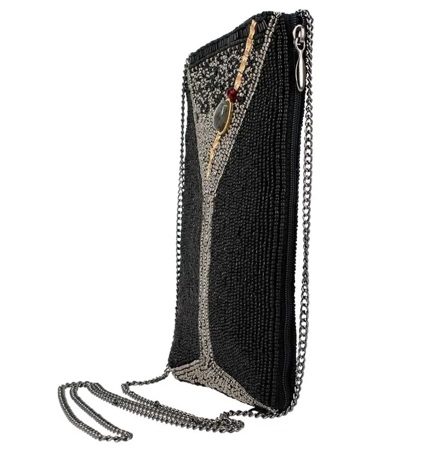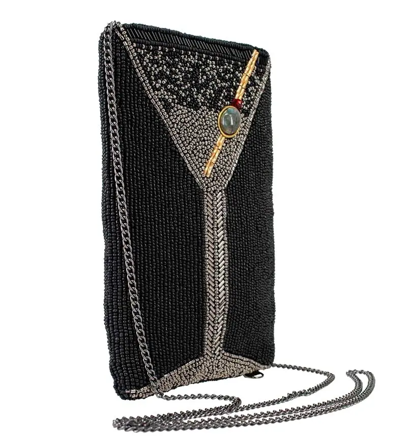 Beaded Crossbody phone bag Make it Dirty by Mary Frances. Exquisite beading with labradorite illustrates the shine of a martini glass, complete with olive and stir-stick details.