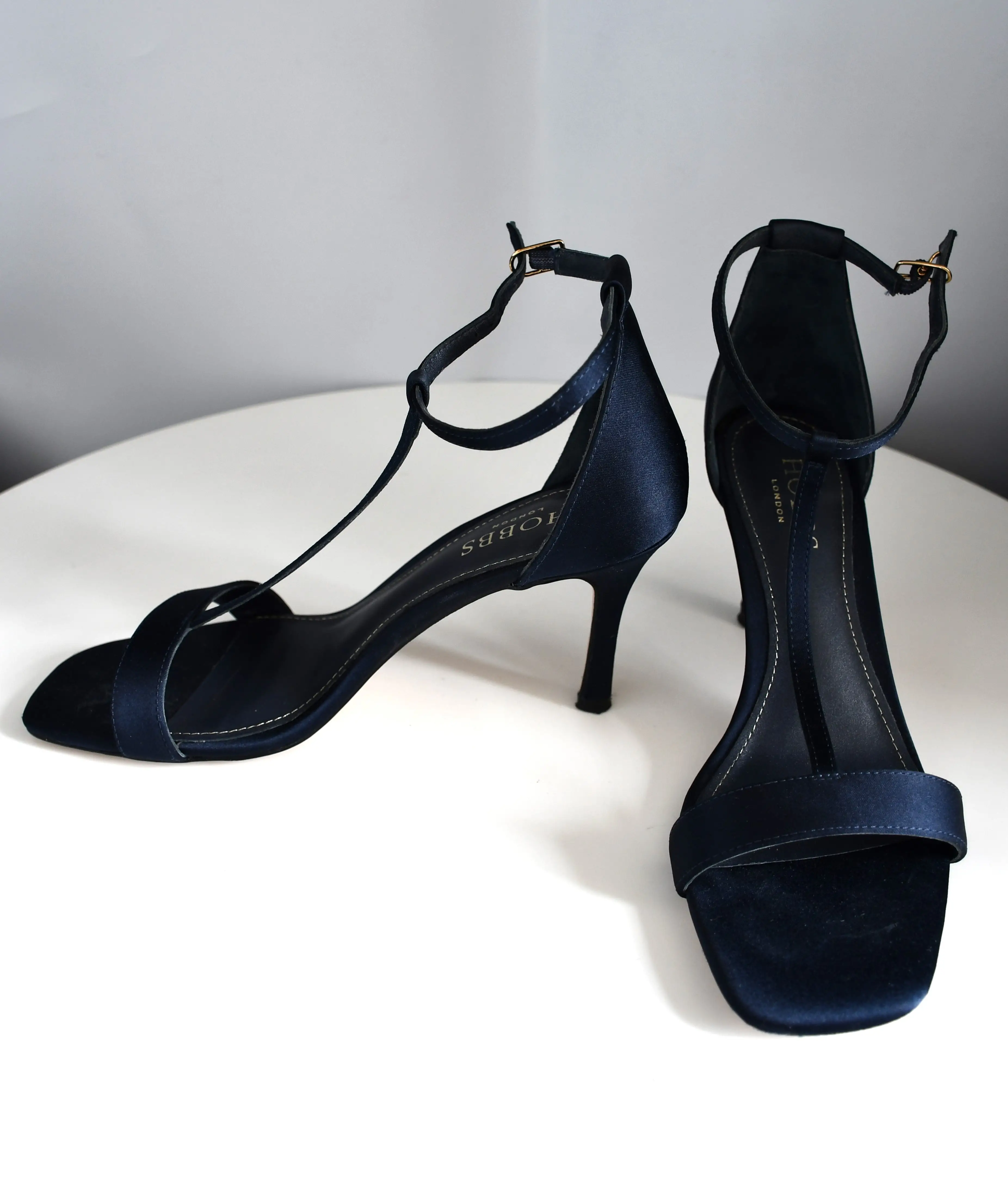 Dark Navy Midnight High Heel Sandals by Hobbs London. The Nadia T-Bar Satin sandals are really comfortable as the insoles are cushioned. Some wear to the sole as shown, which is normal after walking on it. Pre-owned and only worn once. You can walk on these all day without issues or the sandals/straps getting painful. In perfect and as new condition, no marks. Original price £149, now selling on the Hobbs website for £99. Great for any occasion.